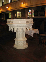 The font is made of Caen Stone from France, The pedestal was part of an earlier Reading Stand to match the pulpit, now removed. The Rood from St John's Church, is made of bronze and copper, and there is ring of eight bells.