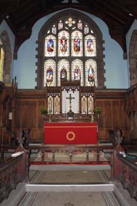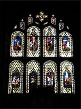 The window, dated 1858, has eight lights depicting scenes from the life of Christ. The figures on the reredos were a later gift.